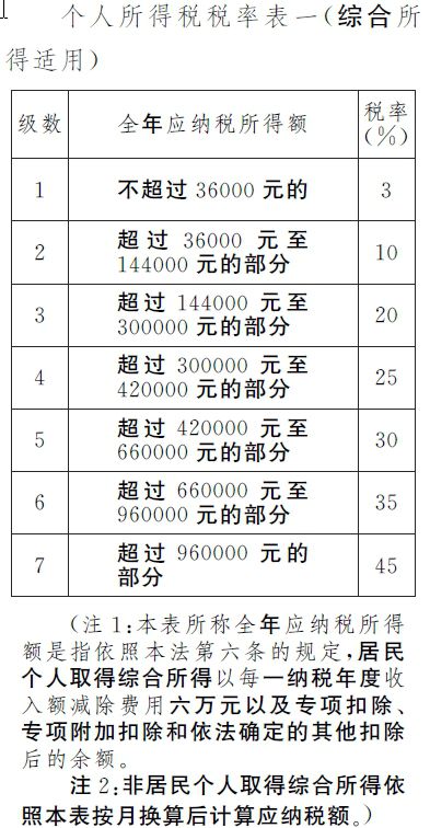 根據(jù)新稅率表,綜合所得應(yīng)該按如下稅率繳稅:全年應(yīng)納稅所得額不超過36000元的為3%;超過36000元至144000元的部分為10%;超過144000元至300000元的部分為20%;超過300000元至420000元的部分為25%;超過420000元至660000元的部分為30%;超過660000元至960000元的部分為35%;超過960000元的部分為45%。