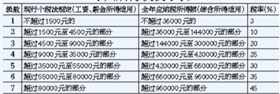 修正案草案將工資、薪金,勞務報酬,稿酬和特許權(quán)使用費等4項勞動性所得(下稱“綜合所得”)納入綜合征稅范圍,適用統(tǒng)一的超額累進稅率。綜合所得適用3%至45%的超額累進稅率。