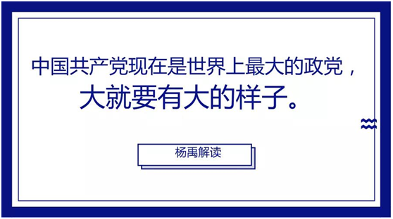 習(xí)近平總書(shū)記在去年十九大之后新常委見(jiàn)面會(huì)上說(shuō):中國(guó)共產(chǎn)黨現(xiàn)在是世界上最大的政黨,大就要有大的樣子。