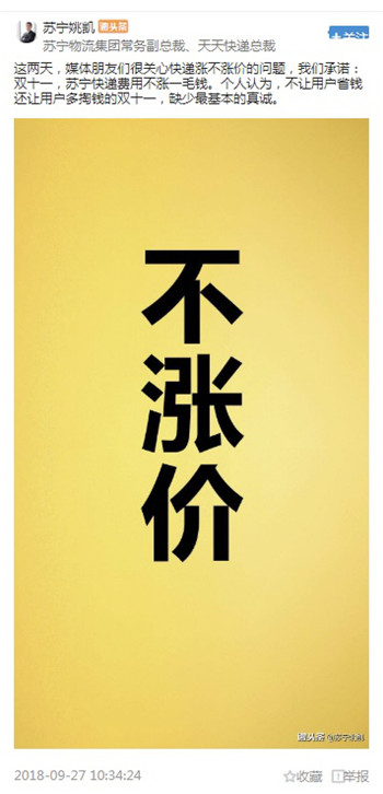 面對(duì)快遞公司的紛紛漲價(jià),不少剁手黨們擔(dān)心,最后的成本都會(huì)出在自己身上。針對(duì)這一熱點(diǎn)話(huà)題,9月27日,蘇寧物流常務(wù)副總裁姚凱通過(guò)微頭條發(fā)聲,承諾這個(gè)雙十一,蘇寧快遞費(fèi)用不漲一毛錢(qián)!他認(rèn)為,不為用戶(hù)省錢(qián)還讓用戶(hù)多掏錢(qián)的雙十一,缺少最基本的真誠(chéng)。