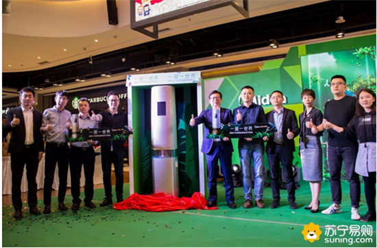 緊接著,陜西蘇寧總經(jīng)理王軍先生和美的空調(diào)陜西產(chǎn)品中心總經(jīng)理余琎先生一起為美的空調(diào)Air空間站揭幕。
