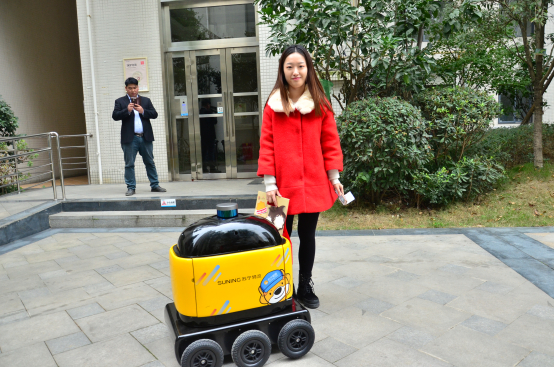 家住藍潤錦江春天8棟的許小姐,下午在蘇寧小店APP下單購買了一袋零食大禮包,短信提醒商品已由無人車送到樓下。這時許小姐下樓看到單元門前等候的無人車,點擊手機短信,輕松就取出了大禮包。第一次收到無人車送來的商品,許小姐表示,“沒想到這個看起來像個玩具一樣的無人車,十幾分鐘就給我送來了零食,還說話提醒我?guī)退P好門,很聰明嘛!