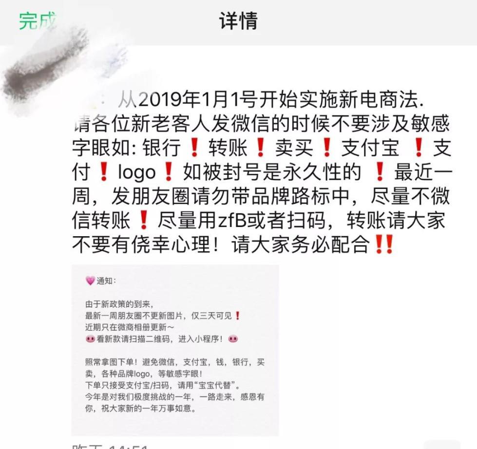 新《電商法》雖然沒(méi)有對(duì)微商、個(gè)人代購(gòu)的監(jiān)管沒(méi)有出具體細(xì)則,代購(gòu)圈內(nèi)卻已流傳了多個(gè)監(jiān)管措施版本,比如“敏感字眼交易雙方封號(hào)”、“不能微信直接付款”、“朋友圈限流和降權(quán)”等。