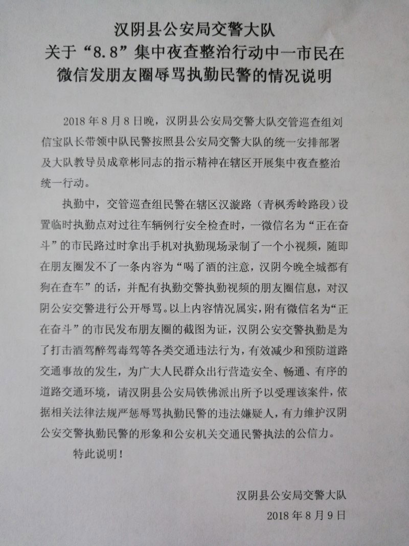 8月8日晚,漢陰縣公安局鐵佛派出所民警接到網(wǎng)友舉報,稱有一名網(wǎng)名叫“正在奮斗”的網(wǎng)友在朋友圈發(fā)布內(nèi)容為“喝了酒的注意,漢陰今晚全城都有狗查車”的辱警信息。接到報警后,鐵佛派出所民警立即開展行動,不到48小時,迅速查處一起尋釁滋事案件。經(jīng)調(diào)查,微信網(wǎng)友“正在奮斗”的真名叫郭某全,1985年出生,住漢陰縣城關(guān)鎮(zhèn)某小區(qū),正是發(fā)布該辱警信息的違法行為人。