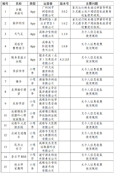 一、全能查詢(xún)寶、商伴同恒等15款A(yù)pp無(wú)個(gè)人信息收集使用規(guī)則或在首次運(yùn)行時(shí)未通過(guò)彈窗等明顯方式提示用戶(hù)閱讀個(gè)人信息收集使用規(guī)則(詳見(jiàn)下表)。