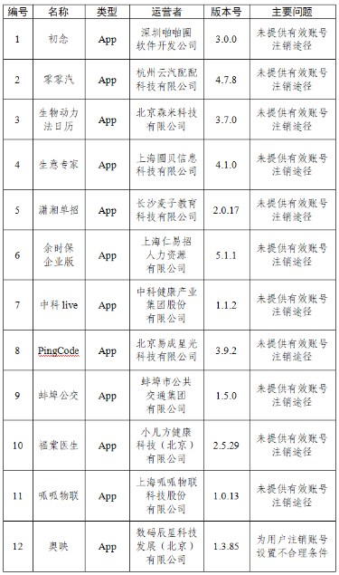 四、初念、零零汽等12款A(yù)pp未提供有效賬號(hào)注銷(xiāo)途徑或?yàn)橛脩?hù)注銷(xiāo)賬號(hào)設(shè)置不合理?xiàng)l件(詳見(jiàn)下表)。