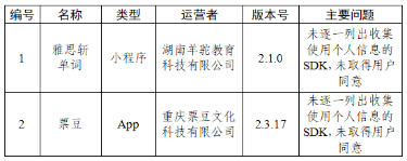 二、雅思斬單詞、票豆等2款A(yù)pp未逐一列出收集使用個(gè)人信息的SDK,未取得用戶(hù)同意(詳見(jiàn)下表)。