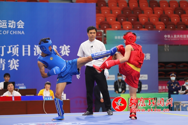 “開始!”隨著裁判員口令,紅藍(lán)雙方運(yùn)動(dòng)員立即展開了激烈的爭(zhēng)奪,賽場(chǎng)上他們毫無畏懼,拳法剛勁兇猛,腿法雷霆萬鈞,摔法干脆利落。“拳腿結(jié)合”“主動(dòng)點(diǎn)”場(chǎng)下教練不時(shí)提醒。觀眾席不斷響起熱烈的掌聲。
