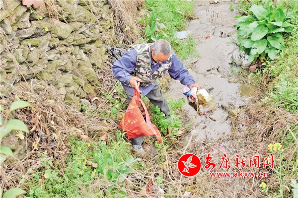 “我前兩天看溝里石頭堆中間有一件被丟掉的衣服,得趕緊撈出來,可不敢等到春天雨水多了。”李輝智回頭對章彩云說,“那是的,現(xiàn)在溝里干凈著呢,我一會(huì)兒回家找個(gè)長竹竿把衣服勾出來,不能讓這些影響了水質(zhì)。”章彩云回應(yīng)道。