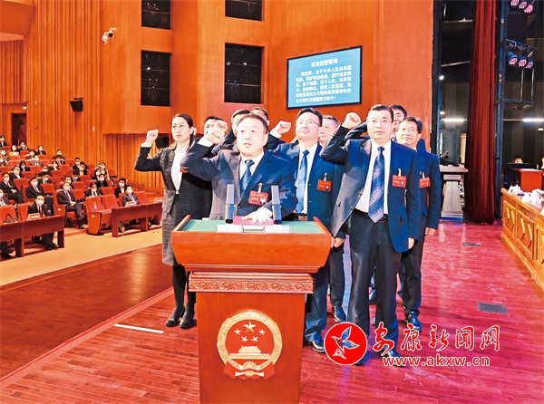 新當選的市級國家機關(guān)工作人員向憲法宣誓,新當選的市五屆人大常委會主任王彪、市人民政府市長武文罡分別領(lǐng)誓。