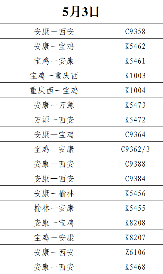 為滿足旅客返程需求,5月3日安康火車站共加開(kāi)旅客列車21列。主要集中在西安、寶雞、榆林、重慶、萬(wàn)源等方向。