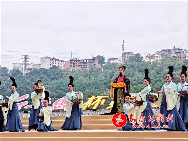 悠悠古琴聲中,青衣女子們手提竹籃蹁躚而來(lái)。“緬懷先賢”,主祭官一聲令下,全場(chǎng)矚目中,9位大漢護(hù)送屈原像至舞臺(tái)中央,開(kāi)幕式翻開(kāi)祭祀篇章。主祭官走向高臺(tái)仰頸高呼:“詠?lái)灱牢?hellip;…”百名身著漢服、手持竹簡(jiǎn)的孩童齊聲詠?lái)灒D挫抑揚(yáng),激蕩云霄。“萬(wàn)民歡慶歌盛世,安瀾裕阜唱安康。”典禮儀成,青衣女子們“兵分兩列”,一列把竹籃里面的粽子拋向江中,追念先賢,一列繞場(chǎng)為現(xiàn)場(chǎng)觀眾贈(zèng)發(fā)香包,送上幸福安康的祝福。