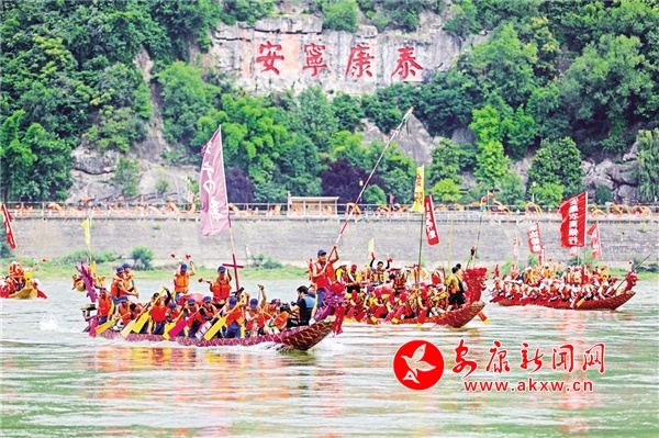 6月22日,第二十三屆中國安康漢江龍舟節(jié)開幕,28支參賽隊伍在漢江上表演龍舟競渡,喜迎端午佳節(jié)。 張昊 攝
