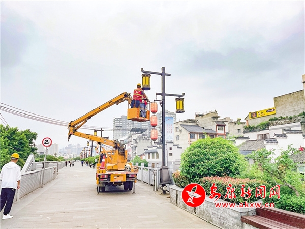 6月21日,安康市政園林處工作人員檢修路燈,營造第二十三屆中國安康漢江龍舟節(jié)的節(jié)日氛圍。 胡波 攝