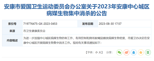 8月30日,安康市愛(ài)國(guó)衛(wèi)生運(yùn)動(dòng)委員會(huì)辦公室發(fā)布《關(guān)于2023年安康中心城區(qū)病媒生物集中消殺的公告》,具體如下。