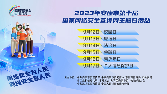 本網(wǎng)訊(記者 趙漪湉)2023年安康市第十屆國家網(wǎng)絡(luò)安全宣傳周將于9月11日至17日在全市范圍內(nèi)統(tǒng)一開展。開幕式、網(wǎng)絡(luò)安全科技成果展、網(wǎng)絡(luò)安全技能競賽、網(wǎng)絡(luò)安全大講堂、“六大主題日”活動(dòng)等重要活動(dòng)將輪番舉行。今年網(wǎng)安周繼續(xù)以“網(wǎng)絡(luò)安全為人民,網(wǎng)絡(luò)安全靠人民”為主題,通過展覽、競賽、講堂等形式,實(shí)現(xiàn)每一主題日都有主題、有活動(dòng),全面營造全社會(huì)共筑網(wǎng)絡(luò)安全防線濃厚氛圍。我市網(wǎng)安周期間,有哪些精彩活動(dòng)可以參與?