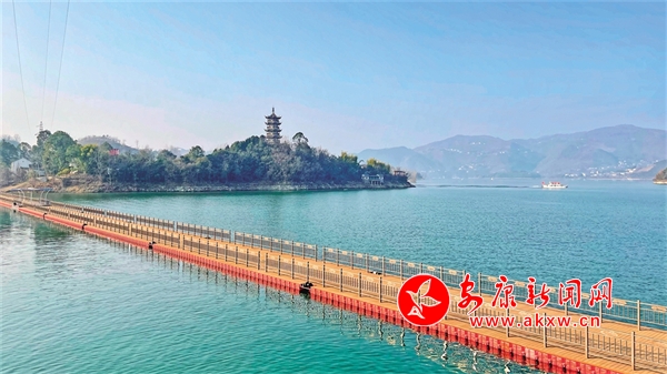 △ 瀛湖新建浮橋,全長(zhǎng)256米、寬6米,連接金螺島與唐家鏈子