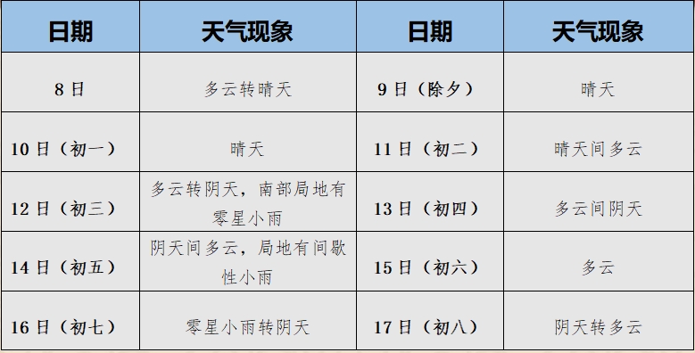 本網(wǎng)訊 2月7日10時(shí),市氣象臺(tái)發(fā)布《春節(jié)天氣預(yù)報(bào)》:春節(jié)前期(除夕到初二)我市以晴天到多云天氣為主,氣溫回升明顯,預(yù)計(jì)全市最高氣溫升至15℃以上,東部縣區(qū)可能接近20℃;初三,陰天,南部局地零星小雨;初四,多云間陰天;初五陰天有間歇性小雨;初六多云;初七零星小雨轉(zhuǎn)陰天;初八陰天轉(zhuǎn)多云。