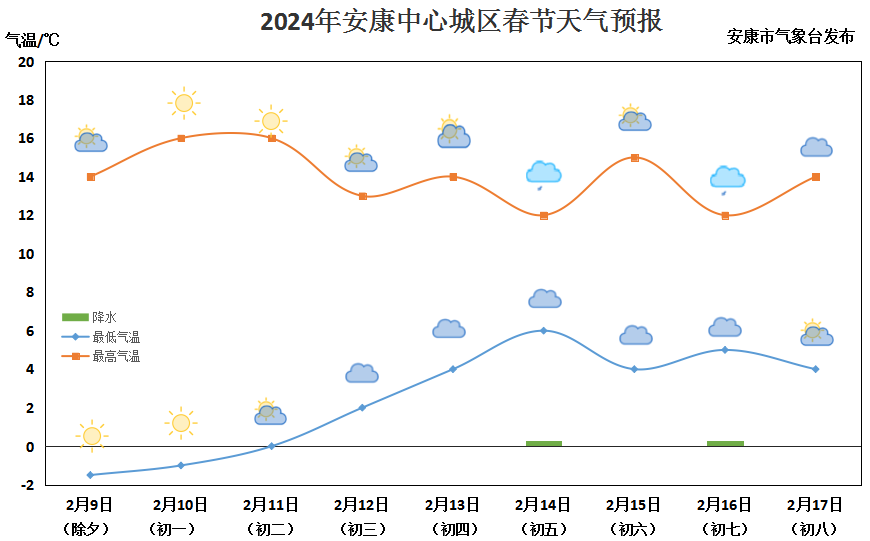 春節(jié)期間冷空氣對我市影響較小,最高氣溫起伏不大,預(yù)計(jì)川道地區(qū) 11~18℃,秦巴山區(qū):8~14℃,最低氣溫初三以前相對較低,后期有所升高:川道地區(qū) -2~5℃,秦巴山區(qū):-5~1℃。