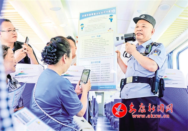 “我已經(jīng)發(fā)展了三個志愿者!”老范一邊興高采烈地說著,一邊從他的工作包中找出志愿者袖標及徽章。就在剛才,在站臺上引導(dǎo)旅客上車的老范憑著自己的親和力,很快就物色了幾名自愿擔(dān)任平安列車志愿者的旅客。老范隨后給志愿者佩戴袖標及徽章,給他們開展崗前培訓(xùn),帶他們在列車上開展反詐和防盜等安全宣傳。