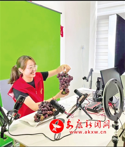 “大家好!歡迎來到山地生態(tài)葡萄直播間,今天給大家?guī)淼氖俏覀冞@兒的招牌水果陽光玫瑰葡萄。”在構(gòu)元社區(qū)的專屬直播間里,志愿者正在進(jìn)行一場直播帶貨。