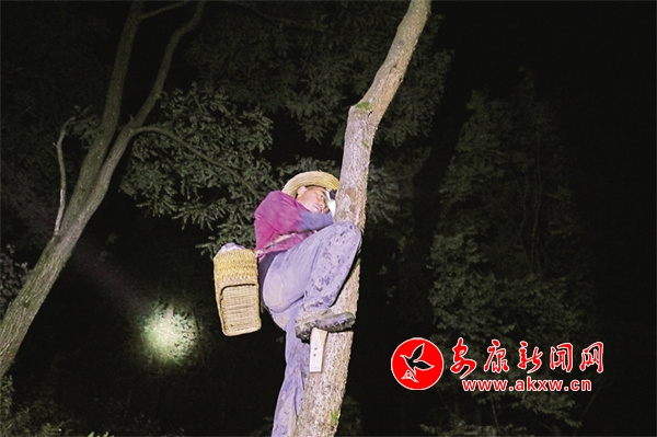從19歲開始,羅宗兵就和這片漆林打交道,哪兒有幾棵樹,哪棵樹上有幾個口子,他都一清二楚。只見羅宗兵頭戴礦燈,熟練地爬到一棵漆樹上,用割漆刀在原來開過口的“牛鼻子”位置輕輕一割,乳白色的液體冒出,隨之緩緩流入到用稠樹葉制作的器皿中。因為生漆有腐蝕性,所以割漆人盛漆選擇的都是楠樹葉或稠樹葉。上樹、下樹、轉(zhuǎn)彎、過河、爬坡……在伸手不見五指的漆林里,羅宗兵穿梭自如。