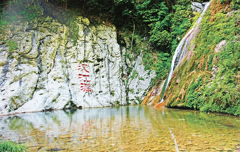 炎炎夏日,秦巴秀水掩映之間,在陜西省漢中市寧強(qiáng)縣漢水源國家濕地公園,一條清澈小溪蜿蜒淌出,溯溪而上,紅豆杉、香果樹等漫山遍野、郁郁蔥蔥,游人如同行走在水墨丹青畫卷中,美不勝收。河谷腹地深處,奇峰怪石點綴,飛瀑流泉高懸,旁邊崖壁上鐫刻著“漢江源”3個大字。