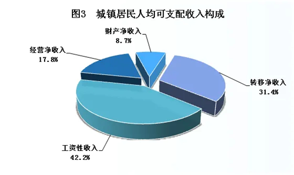 全市城鎮(zhèn)居民人均可支配收入33639元,比上年增加1663元,增長5.2%。其中,工資性收入14181元,增長5.0%,占可支配收入的比重為42.2%;經(jīng)營凈收入5995元,增長4.7%,占比17.8%;財產(chǎn)凈收入2910元,增長5.8%,占比8.7%;轉移凈收入10553元,增長5.6%,占比31.4%。