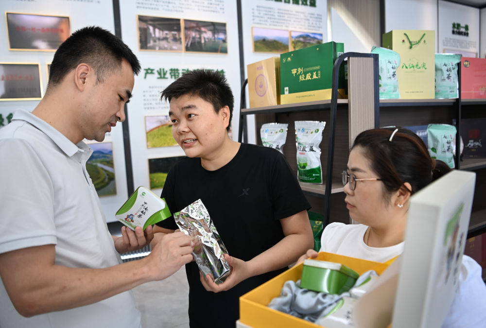 蔣家坪村民(中)向游客銷售茶葉。(平利縣委宣傳部供圖)