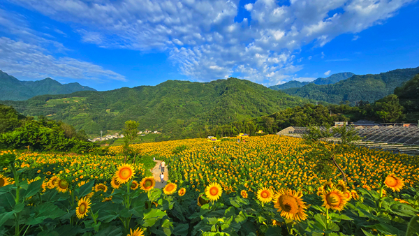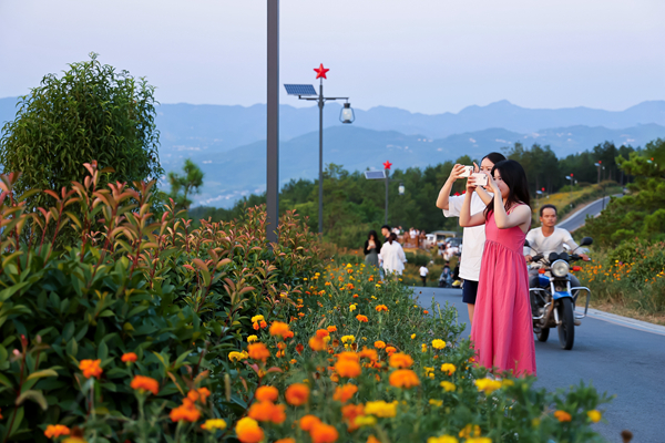 漢濱區(qū)牛嶺社區(qū)花海步道吸引游客打卡拍照。 周濬 攝Xfq安康新聞網(wǎng)