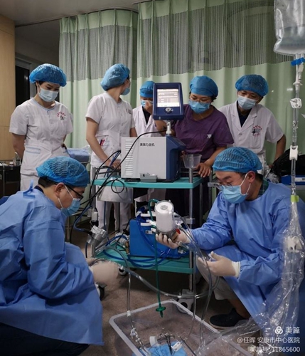 心內(nèi)科一病區(qū)全科醫(yī)護(hù)人員都在緊鑼密鼓地為ECMO治療前做充分的準(zhǔn)備,包括人員的調(diào)配、物資的準(zhǔn)備、ECMO儀器的調(diào)試。ICU李江主任親自參與了整個(gè)救治過程,介入中心、麻醉科、呼吸科都派出精兵強(qiáng)將協(xié)助手術(shù)開展。晚上11點(diǎn),在所有人員、物資到位后,馬上開始了ECMO的管路預(yù)沖,股動、靜脈鞘管的置入。當(dāng)ECMO儀器啟動,離心泵運(yùn)轉(zhuǎn),暗紅色的血液從股靜脈引出,然后經(jīng)過膜肺氧合,轉(zhuǎn)變?yōu)轷r紅色的血液再從股動脈回到患者的體內(nèi),很快患者心率血壓得到穩(wěn)定、血氧飽和度顯著改善,患者癥狀也得到緩解。
