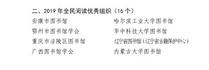 全國16個單位被評為“2019年全民閱讀優(yōu)秀組織”,其中高校圖書館4個,公共圖書館12個。安康市圖書館在2019年全民閱讀宣傳工作中,積極宣傳和踐行社會主義核心價值觀,弘揚中華優(yōu)秀傳統(tǒng)文化,組織策劃開展了“全市同讀一本書”、“全市同讀一小時”、“全市同讀一類書”等“全市同讀”系列活動,形成了全市一盤棋的業(yè)務格局,充分發(fā)揮了市館的“中心引領”作用,深入推進了全民閱讀工作。