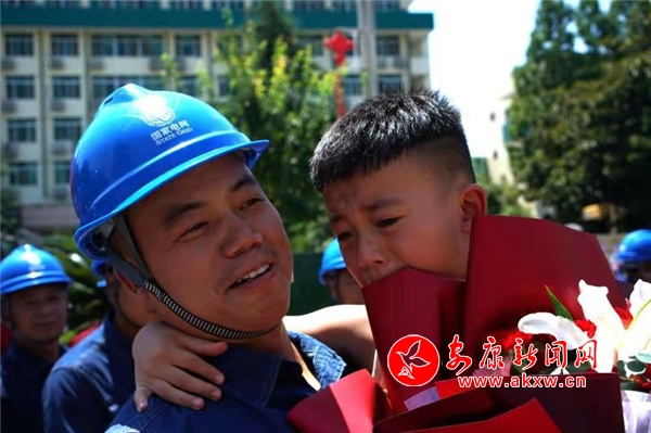 11時許,搶險車隊在漢濱騎警的護送下,緩緩駛入公司門口,在陣陣掌聲中隊員們依次走下?lián)岆U車,他們個個精神飽滿、笑容燦爛。“熱烈歡迎國網(wǎng)安康供電公司抗洪援豫突擊隊的英雄勝利歸來!”“英雄們辛苦了!”……在儀式現(xiàn)場,迎接人員為公司突擊隊隊員們拉起橫幅、鼓掌歡呼。
