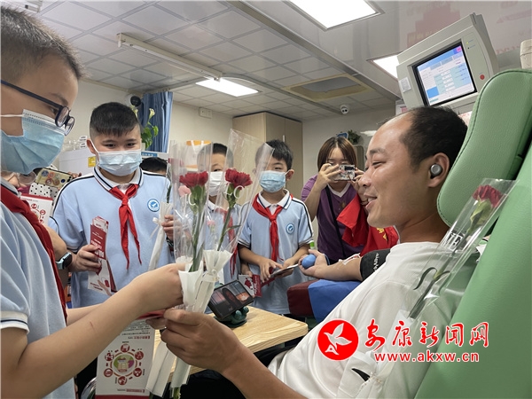 隨后,在采血車內,醫(yī)務人員從血液成分、獻血條件、獻血流程等方面為孩子們現(xiàn)場講解。孩子們?yōu)橹驹刚攉I花,表達敬意。