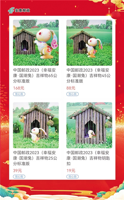 目前該產(chǎn)品有四款規(guī)格:12厘米的鑰匙扣(包掛或車(chē)掛);25厘米手辦禮物玩偶;45厘米中型玩偶;65厘米收藏級(jí)玩偶。為滿足更多的群眾需求,安康郵政打通內(nèi)外部平臺(tái),搭建線上線下銷(xiāo)售渠道,線下在郵政各網(wǎng)點(diǎn)、合作單位宣傳展示;線上通過(guò)京東商城、Ai郵安康抖音等全面推廣。結(jié)合即將來(lái)臨的春節(jié)氛圍營(yíng)造,安康郵政各營(yíng)業(yè)網(wǎng)點(diǎn)特別布置了“玉兔呈祥·幸福安康”打卡專(zhuān)區(qū),供喜愛(ài)國(guó)潮毛絨玩具的廣大群眾打卡留念,為癸卯年新春的到來(lái)新增了更多喜慶祥和的氛圍。