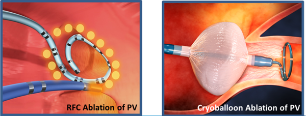 導(dǎo)管消融手術(shù)是房顫的根治性治療手段,目前在房顫介入治療領(lǐng)域,存在著一曲冰與火之歌——冷凍球囊消融技術(shù)與射頻消融技術(shù)。前者是通過電灼燒使靶點(diǎn)細(xì)胞變性壞死,后者則是通過冷凍劑蒸發(fā)吸取組織的大量熱量,快速降溫來實(shí)現(xiàn)消融。