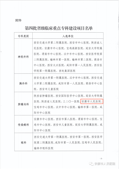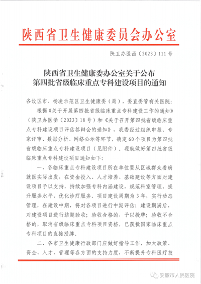 近日,陜西省衛(wèi)生健康委發(fā)文公布了第四批省級臨床重點?平ㄔO項目名單,安康市人民醫(yī)院腫瘤內(nèi)科名列其中,順利被評定為省級臨床重點?平ㄔO項目。