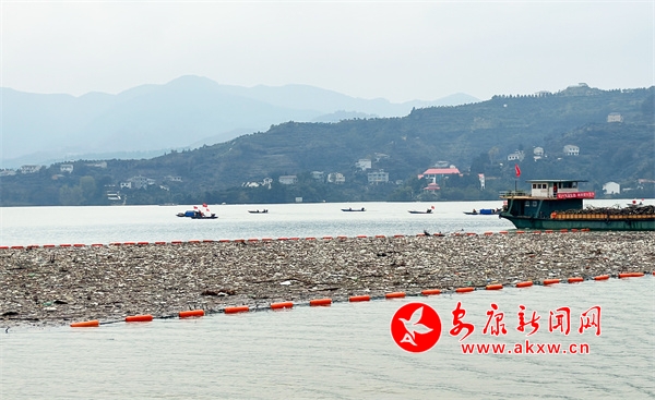 10月15日,筆者跟隨打撈隊來到瀛湖鳥島,大量的漂浮物被圍攔在河灣附近,與主河道形成鮮明對比。打撈隊負(fù)責(zé)人袁曉林介紹:“因秋淋天氣,9月中下旬起,安康經(jīng)歷十幾天的連陰雨,水位上漲,岸邊被淹沒的樹木、雜草就會在水面漂浮,影響水質(zhì)和景觀。我們在景區(qū)鳥島、清泉村、湖心街、南溪、流水等地分段集中打撈,提高效率,不影響旅游和通航。”