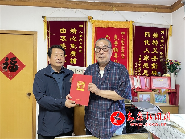 本網(wǎng)訊(通訊員 阿龍 培華)全國聞名的西安兒歌大王魯遷先生,積極響應(yīng)安康市圖書館、安康市書香少兒讀書會“我為留守兒童捐圖書”的倡議,于6日4日捐贈個(gè)人著作及私人藏書157冊。安康市書香少兒讀書會負(fù)責(zé)人登門致謝,并頒發(fā)《捐贈證書》。