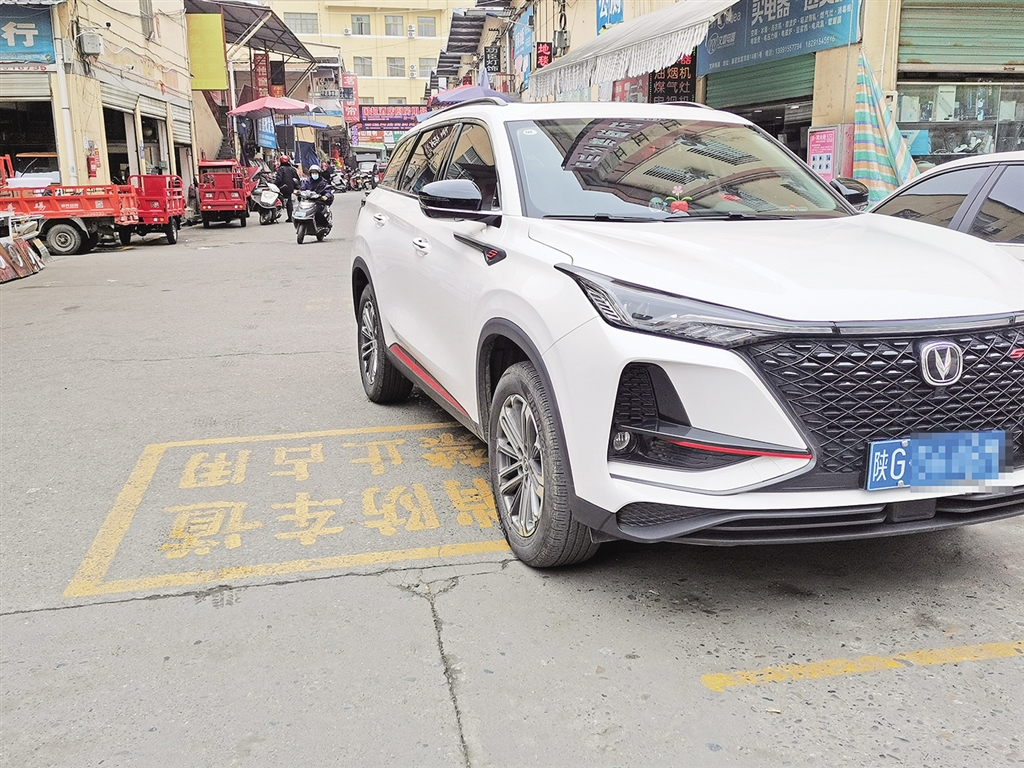 三橋批發(fā)市場內(nèi),一輛白色小轎車停放在消防車道標(biāo)識(shí)之上