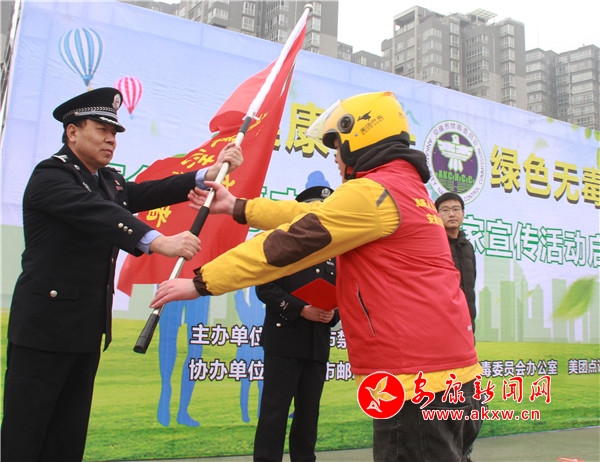漢濱區(qū)禁毒志愿者,郵政管理局快遞騎手,美團(tuán)點(diǎn)評(píng)公司送餐騎手共同組成宣傳志愿者方隊(duì)。