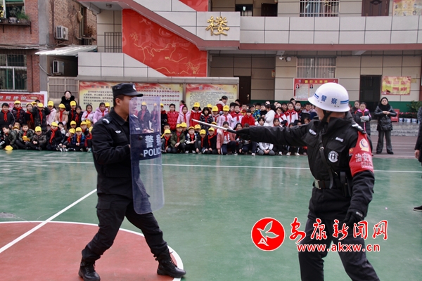 師生們?cè)谠⒔逃跇返倪^(guò)程中,進(jìn)一步增強(qiáng)了安全防范意識(shí)和面對(duì)突發(fā)情況的處置能力;顒(dòng)中,特警們還對(duì)校園護(hù)校隊(duì)的隊(duì)員們進(jìn)行了安全知識(shí)培訓(xùn),并就防暴盾、防暴叉等安全設(shè)備的正確使用做了詳細(xì)講解和模擬演示。