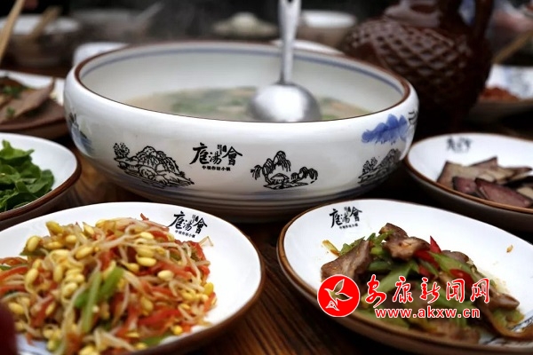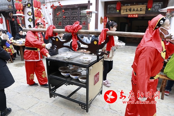 庖湯會(huì)的重點(diǎn)是吃“庖湯宴”。下午四點(diǎn),庖湯宴正式開席。賓客8人一組圍桌而坐,28道石泉庖湯宴美食依次登場上桌,說菜人口吐蓮花,菜越說越香;酒歌高亢,越喝越暖;競?cè)ち,秦巴漢子劃出豪邁風(fēng)采;作坊小鎮(zhèn)聲動(dòng)震天,年味香飄十里。