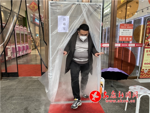記者來(lái)到位于金州路的金坊國(guó)際購(gòu)物廣場(chǎng),該商場(chǎng)門(mén)口設(shè)置有一個(gè)顯眼的消毒室,前來(lái)購(gòu)物的顧客須先測(cè)量體溫,然后進(jìn)入消毒室消毒五秒以上,完成消殺過(guò)程,才能進(jìn)去商場(chǎng)選購(gòu)貨品。