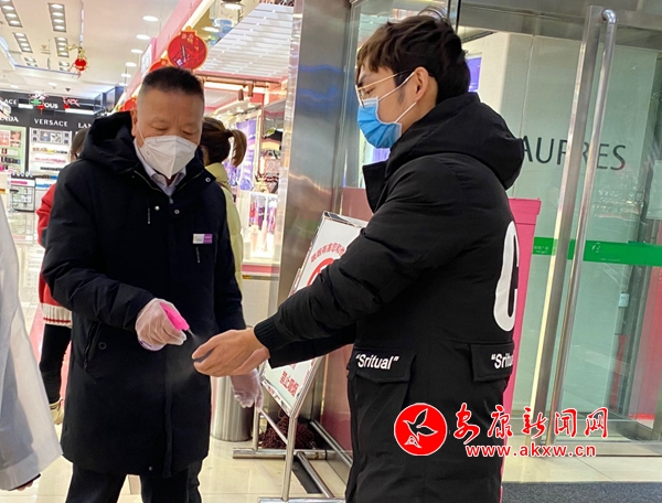 記者來(lái)到位于金州南路的時(shí)代購(gòu)物廣場(chǎng),觀(guān)察到店門(mén)口設(shè)有專(zhuān)門(mén)的測(cè)溫點(diǎn),每個(gè)前來(lái)的顧客都需要先進(jìn)行體溫測(cè)量,然后由工作人員對(duì)顧客的手部進(jìn)行消毒,盡量保證顧客在選購(gòu)貨品的時(shí)候不會(huì)產(chǎn)生交叉感染。同時(shí),地上鋪有消毒地墊,每個(gè)顧客都需要踏上去對(duì)鞋底就行消毒。