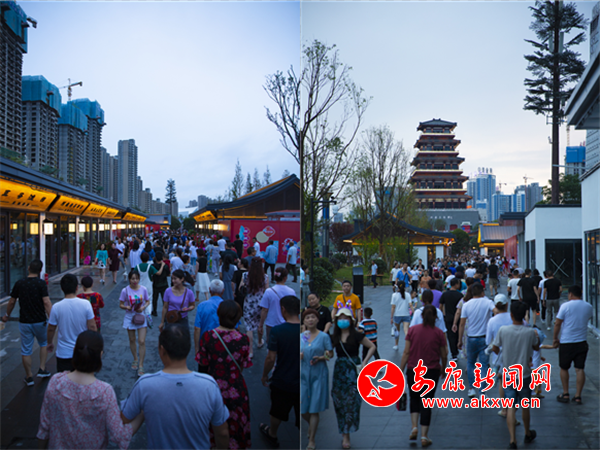 6月28日晚,夜色漸臨,漢江邊上,西城閣旁,古西城文化園(西城坊)游人如織。人們?nèi)宄扇,或乘涼游玩,或聚餐暢談,一派繁華熱鬧景象。(記者 張世虎 攝) Bw3安康新聞網(wǎng)