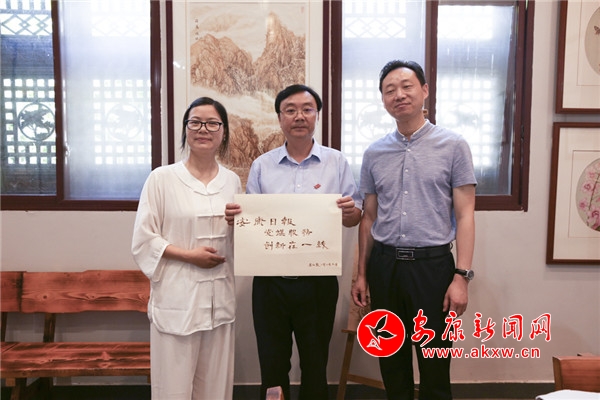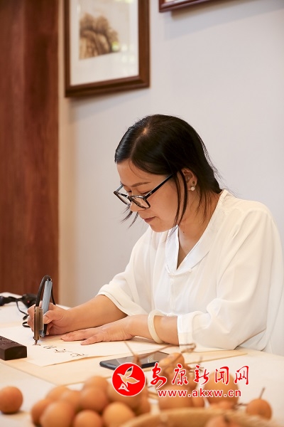 6月24日,李紅霞為安康日?qǐng)?bào)社烙畫作字——“黨媒服務(wù)創(chuàng)新在一線”。烙畫又稱火筆畫,中國(guó)傳統(tǒng)藝術(shù)珍品,用火燒熱烙鐵在物體上熨出烙痕作畫。烙畫創(chuàng)作在把握火候、力度的同時(shí),注重“意在筆先、落筆成形”。