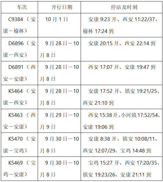 國(guó)慶加開列車車次、日期、停站及時(shí)刻信息如下: