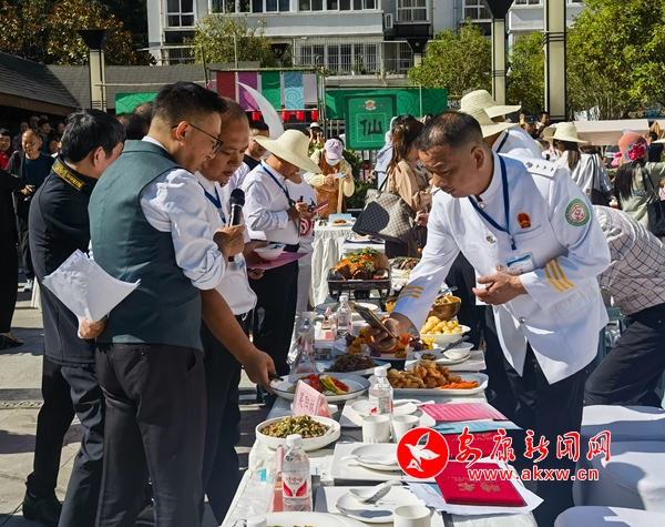 活動現(xiàn)場,來自八仙鎮(zhèn)各村組的19組選手,紛紛拿出自己的看家絕活,在現(xiàn)場設(shè)置的灶臺前,煎、炸、煮、蒸、炒,各式烹飪手法齊上陣,金銀蛋卷、洋芋粑粑炒臘肉、天蒜土豆絲、天麻烏雞湯一道道美味佳肴精彩亮相。