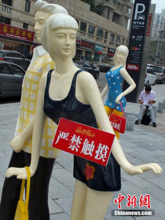 2014年8月6日,湖北宜昌市桔城路福久源商業(yè)街廣場(chǎng)上塑起4個(gè)嶄新的時(shí)尚模特塑像,其中3個(gè)“胸器”誘人的性感女模特塑像身上掛出了“嚴(yán)禁觸摸”提示牌。 圖片來(lái)源:東方ICyGQ安康新聞網(wǎng)